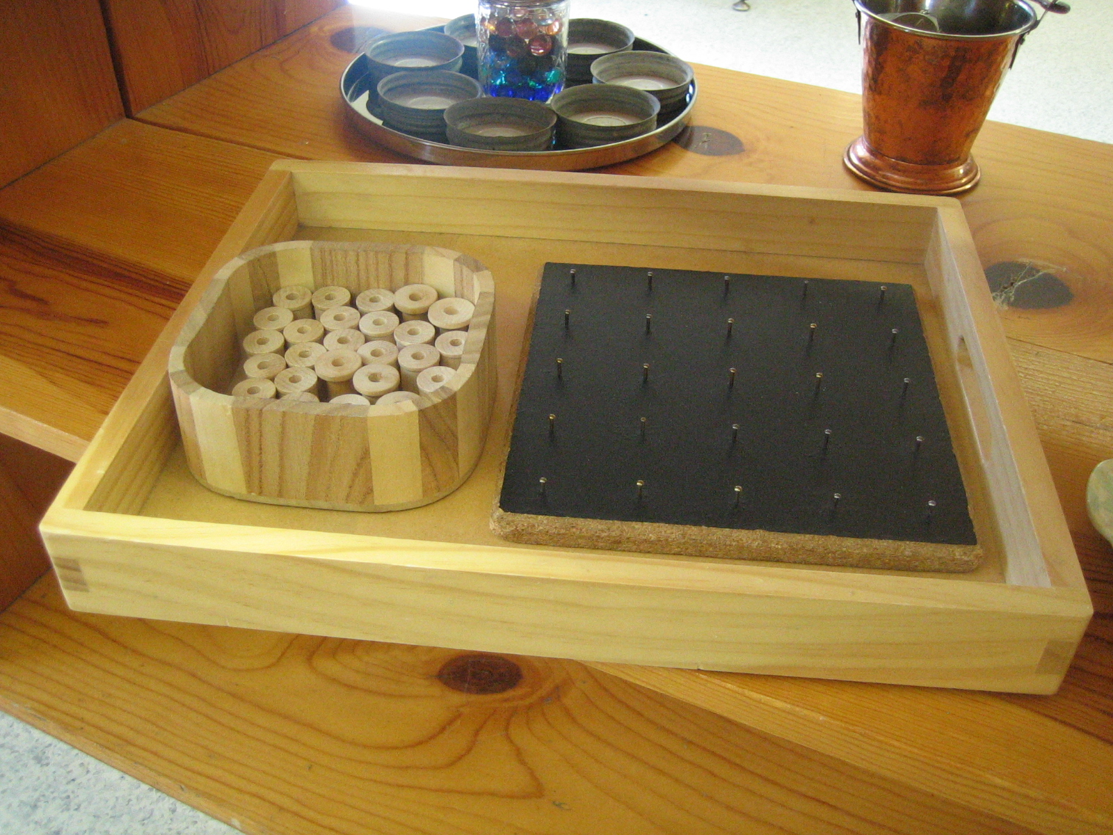The saddle brings a touch of pioneer life to the practical life work of polishing. Additional practical life shelves are full of materials that would be familiar items to pioneer children: