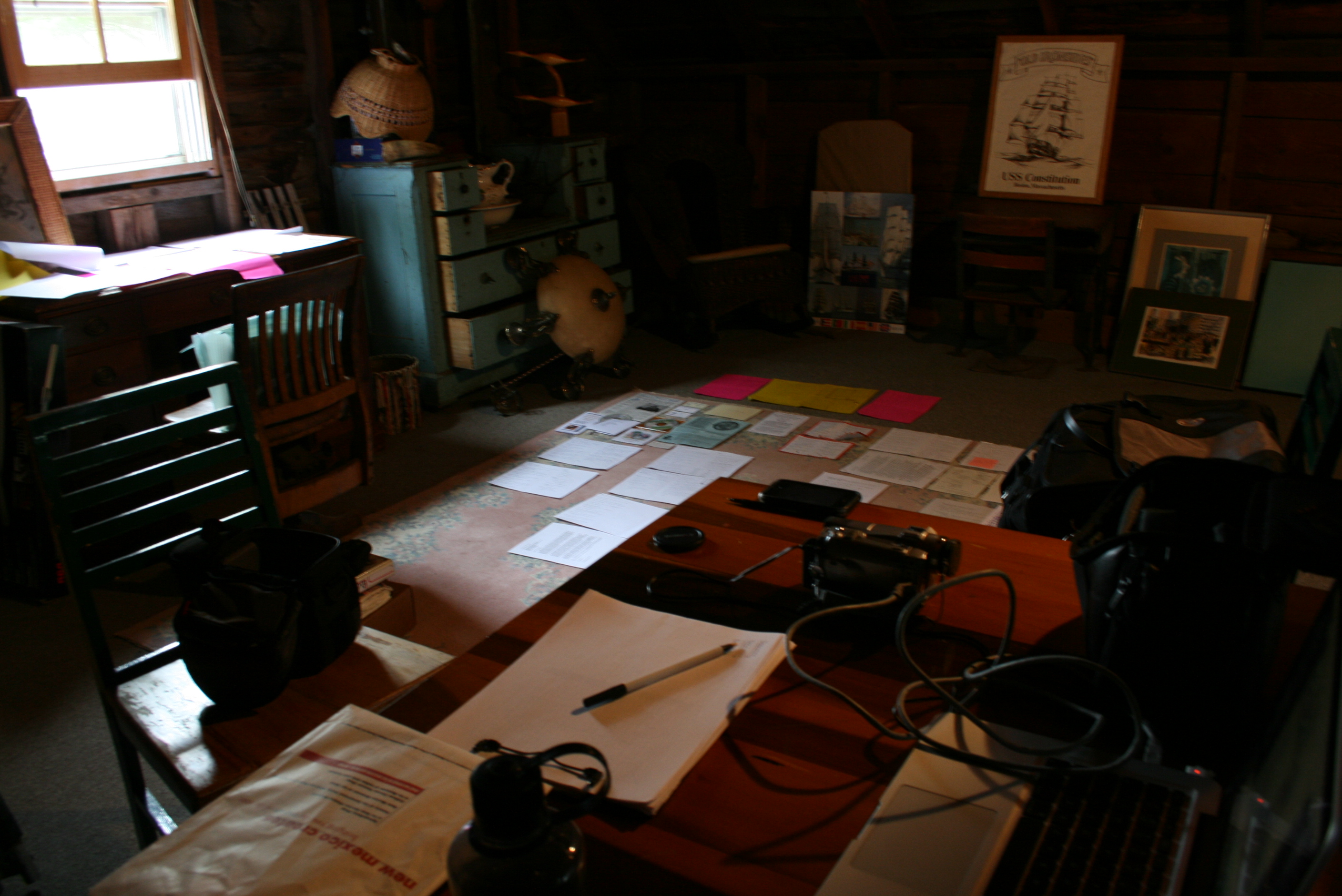 Here’s a behind-the-scenes look at the editing process. It’s a fairly simple process, the biggest challenge is finding chunks of time to do it. I usually set up my laptop and camcorder in the barn of the house where I’m staying for the summer. On the floor you can see scripts and interview sheets set up for each of the school visits.